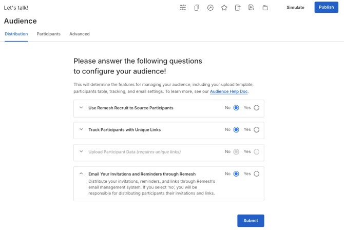 Before configuring your Audience in Remesh, you will need to create your Conversation. Once you create your Conversation, you can begin your audience management. Upon accessing the Audience page of your Conversation, you will be prompted to make selections to configure your audience, then click submit. Read on to learn more about each of these options.