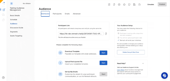 Although we recommend utilizing our tools for audience communication, if you choose to recruit and communicate with participants off Remesh you would simply copy your link if you’re using a single participant link, or download your links if you are using unique links and use your own tool to manage sending links to participants. - Is there a way for two conversations to have the same link?