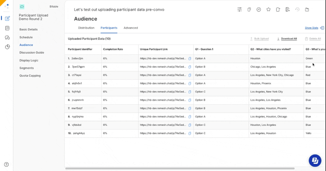 Upload participant data if you have poll or demographic data collected outside of Remesh that you would like to include in the Conversation and attach to participants. Or choose to collect participant data within Remesh if you do not have data collected from participants outside of the platform.