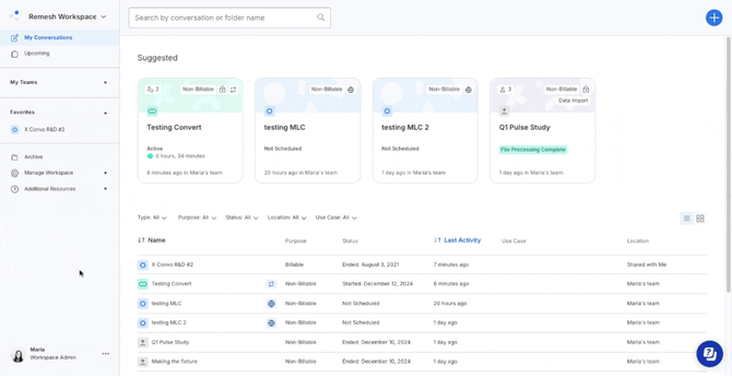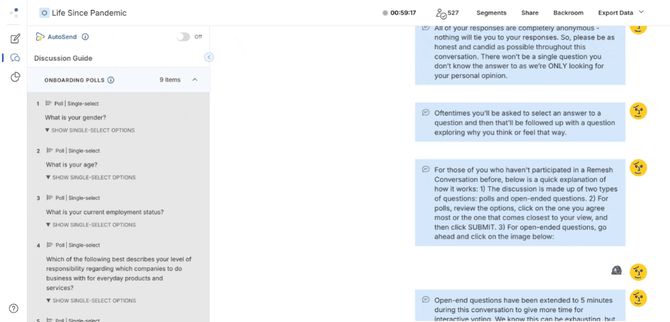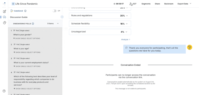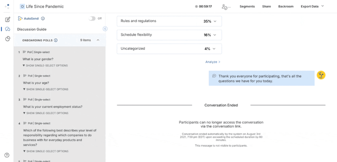 In Live and Flex Conversations, Conversation Data will include all parts of the Remesh Conversation. In a Video Conversation, Conversation data will include any pre- and post-interview questions which are asked asynchronously before and after your Video Interviews.