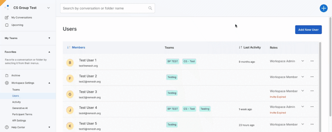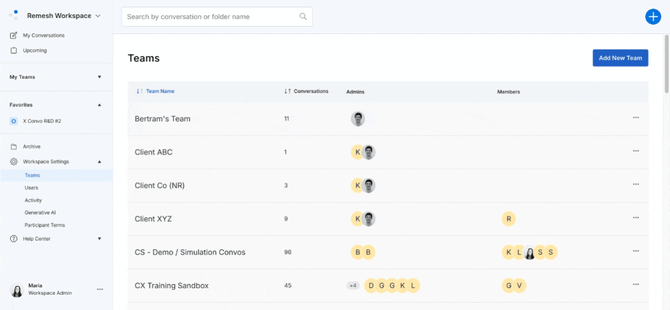 A Workspace is the broadest access level within Remesh. Within your Workspace you will find Teams and within Teams will be your Remesh Conversations. A Workspace Administrator has a number of tools and settings at their disposal for managing their Workspace, Teams, Conversations and users.