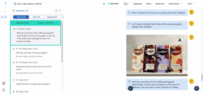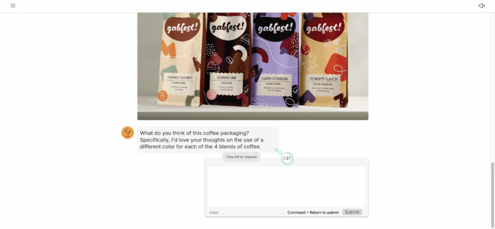- Best for getting the “why” behind participants’ thoughts and opinions. Quickly surfacing ideas that resonate with your audience.