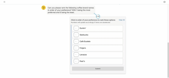 Ranking questions allow participants to rank between 3+ options based upon preference.| Participant | Moderator |